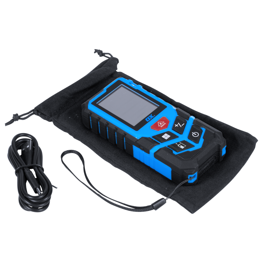 The OX Pro Laser Distance Measure – 40m is a versatile tool for precise measurements. It features Li-ion USB-C charging for convenience and longevity. This device calculates distances in both Metric and Imperial units and includes functions for area, perimeter, and past distance memory. The TPE overmold ensures a secure grip and slip protection. With a 40m range, OX delivers reliable performance for any measuring task.