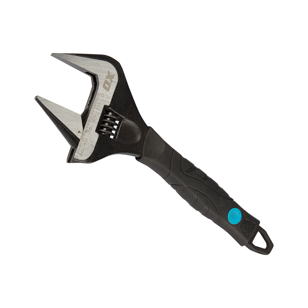 The OX Trade Ultra Wide Jaw Adjustable Wrench features an ultra-wide jaw opening and a slim head design for access to tight spaces.